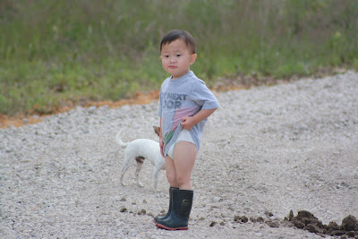 | All the dressy clothes and this is what they really want to do. Play on daddy's trailer. lol...barefooted, William barebottomed, Wen has his basket and William a Dr. Pepper. This is what biggerdirt is all about. All babies went to bed by 830 very easy! |